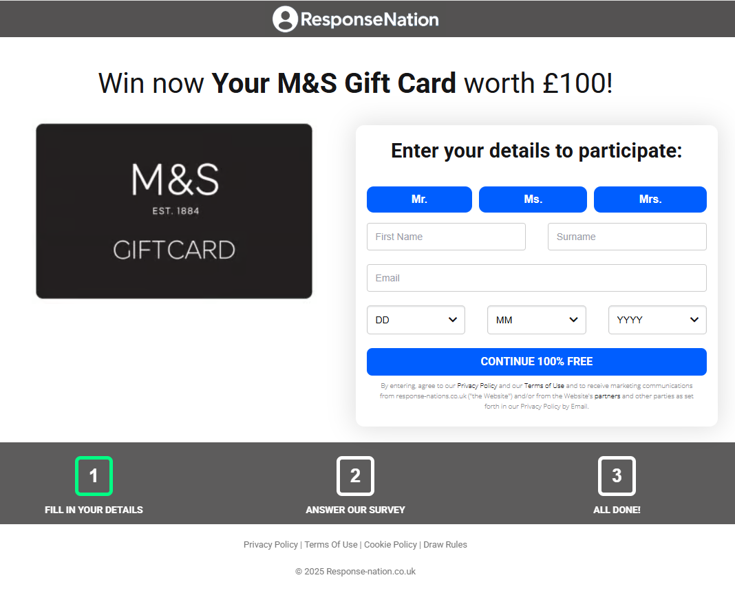 Win now Your M&S Gift Card worth £100! Converts on SOI Geo: GB Traffic allowed: Incent,Display,Banner,Native Restrictions: No Misleading lead,Wrong email id ,No Adult traffic