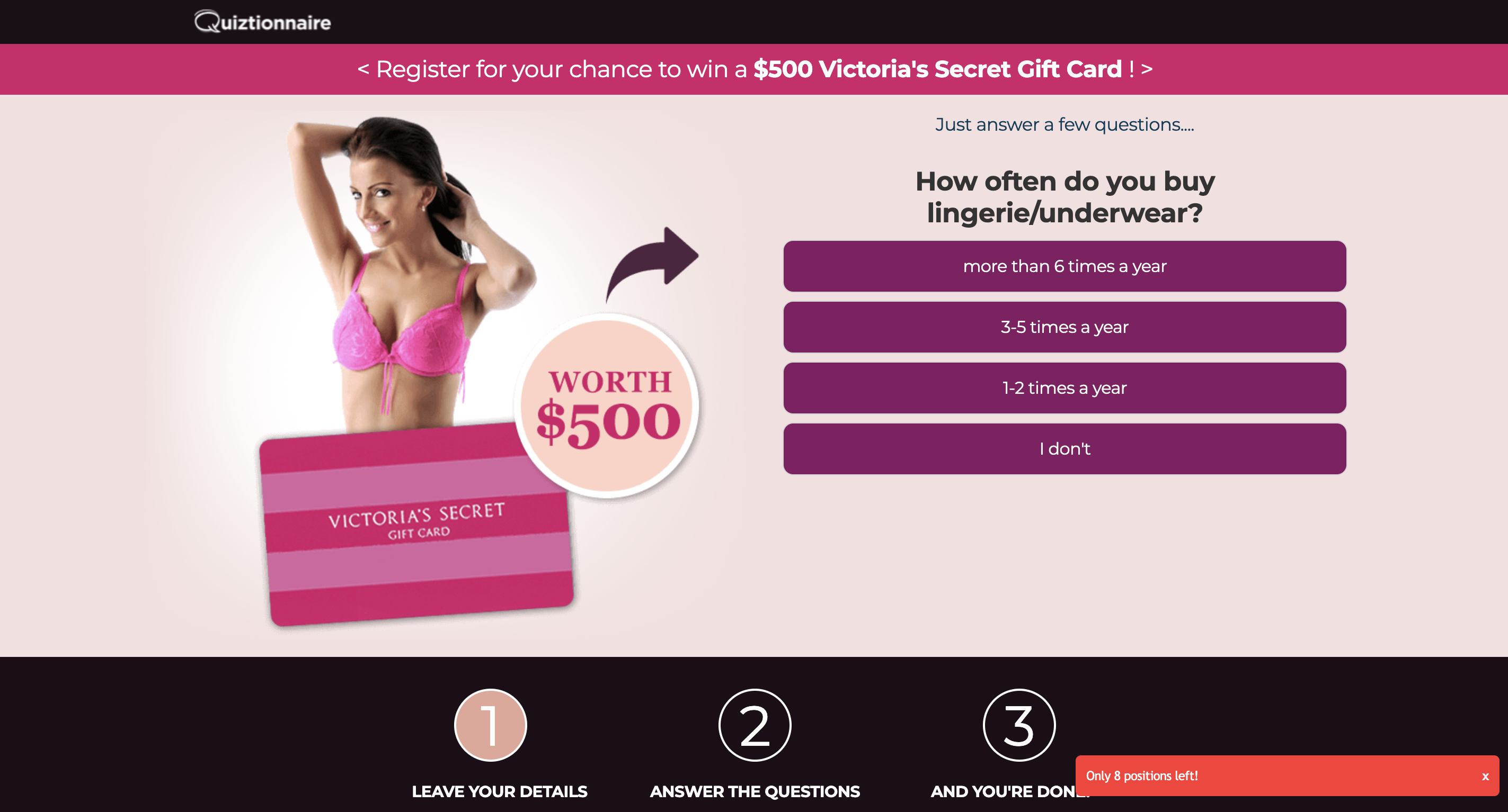 | Offer Name: | AU - Quiztionnaire 8 - Victorias Secret Giftcard FB - (CPL) |