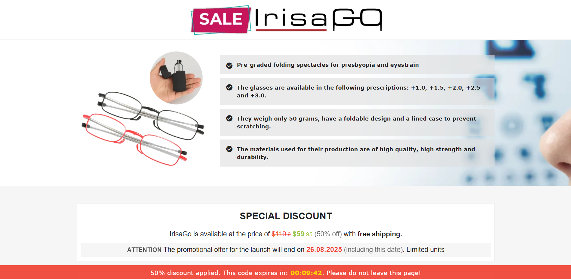 | Offer Name: | [WEB+MOB] IrisaGo – Presbyopia Glasses /International (112 GEOs) CPS *FB/TT/Google/Taboola Pixel* [Approval Required] |