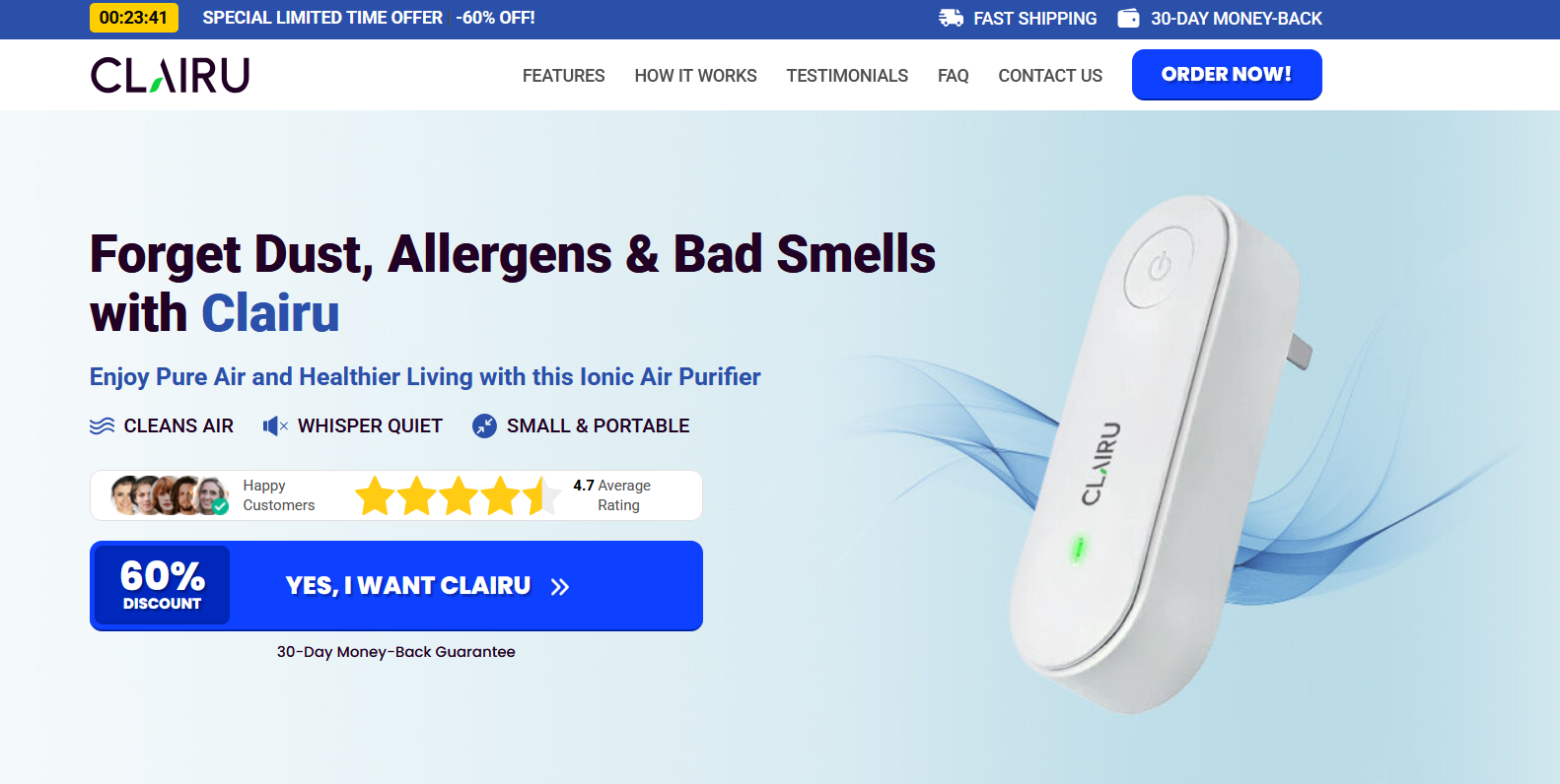Clairu is an ionic air purifier that utilizes negative ions to cleanse your indoor air, effectively removing dust, allergens, and odors without the use of filters or chemicals. Its compact, portable design ensures whisper-quiet operation, making it suitable for various spaces. The device offers a 30-day money-back guarantee and is currently available at a 60% discount.