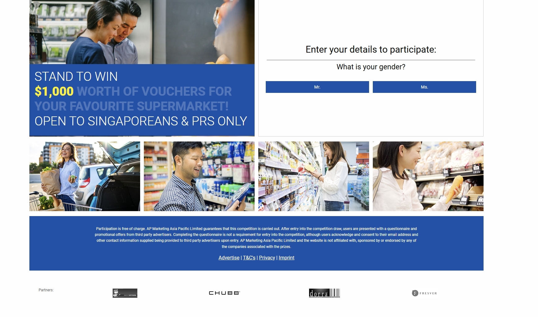General daily cap 200 conversions! Conversion: Finish signup form. Traffic: SG onlyIncentivised: NOContextual :YESBanner: YESExit traffic from CC submit flow: NOEmail: YESSearch: YES (no brand bidding and/or any brand misuse)Coreg: NOSocial Media: YESPush: YESSMS: NO Terms and Conditions:- Please have all pages approved by your affiliate managers before running the offer. Ensure that your advertising materials only show brands displayed on the offer. No misleading ad flows or promise of prize is allowed. Please send a notification by email to [email protected] in the event you want to resume or start promoting an offer.- Only SG traffic allowed- Please target Singaporeans and Permanent Residents (PRs) only. Please include "Open to Singaporeans and PRs only" on all ad copies.- Strictly no incentivized traffic- The advertiser reserves the right to check the validation of the lead up to 72 hours after the user registered- No misuse / misrepresentation of 3rd party brands.- Users must be 24+If these terms are not followed publishers will not be paid for any leads delivered. Kindly note that payments from the APAC entity will be processed within 3 working days after a credit note is generated.   Blacklisted brands:IKEADisneylandNiveaNTUC FairPriceMcDonald'sBanned company/affiliates:E-Communication LTDevania GmbHIAM Solutions Ltd.Weedo ITEmailNation BVTycho MediaLeadsection FZC (ex. Norgaard Medier)50th RevenueLegendary PaprikaSpread DataKayzeleen BanicoAdindex GmbHCanal Mail SARL3G TRAFFIC SOLUTIONS LTDGlobal Traffic Ocean