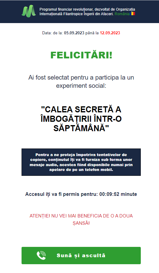 | Offer Name: | [MOB] White One Page Financial Experiment /RO Click2Call *FB/TT Pixel* |