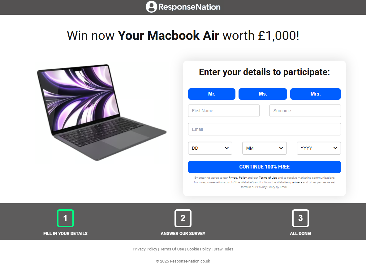 Win now Your Macbook Air worth £1,000! Converts on CPL Geo: GB Traffic allowed: Incent,Display,Banner,Native Restrictions: No Misleading lead,No wrong email id ,No Adult traffic