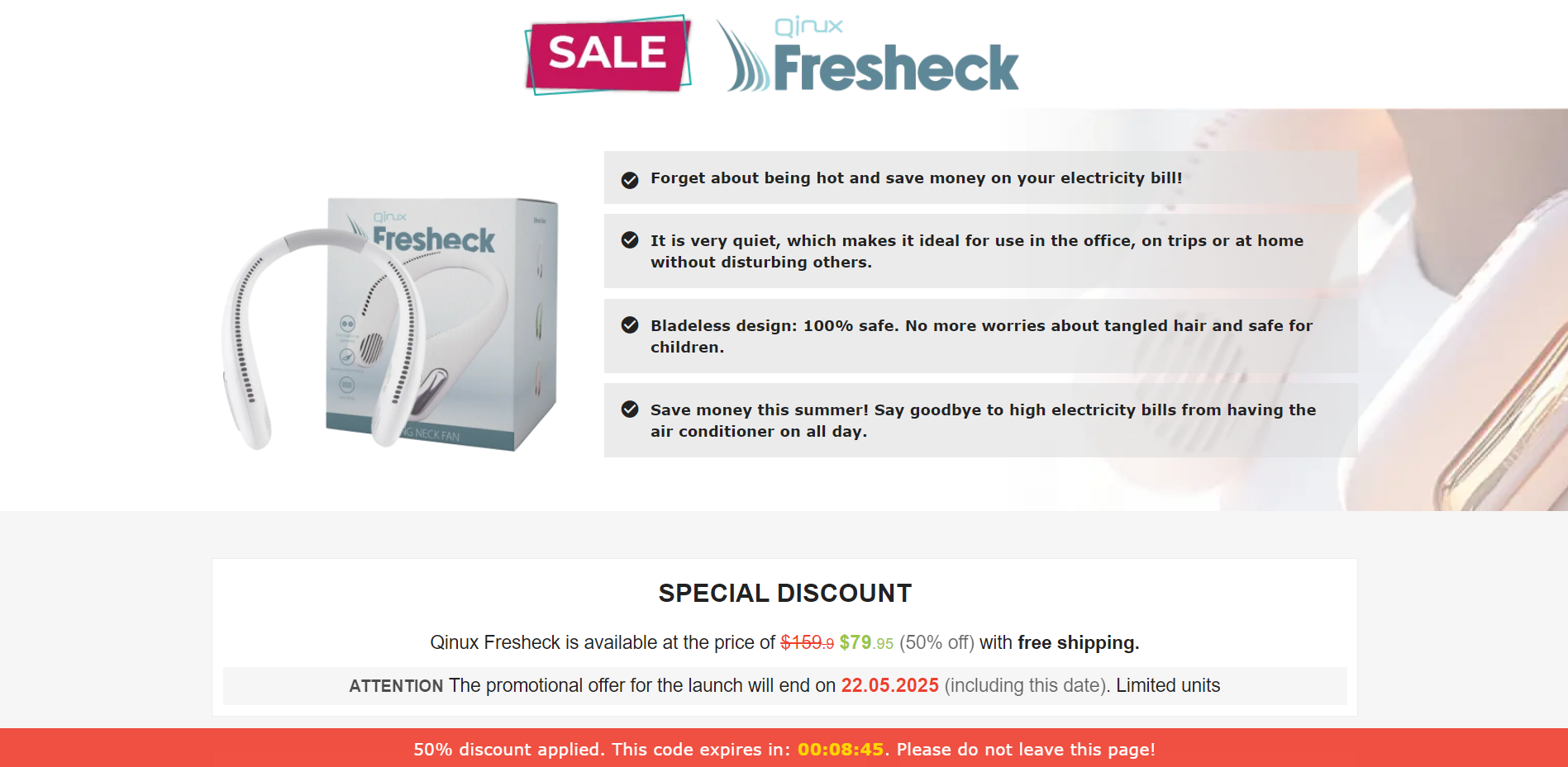 | Offer Name: | [WEB+MOB] Qinux Fresheck – Neck Air Fan /International (112 GEOs) CPS *FB/TT/Google/Taboola Pixel* [Approval Required] |