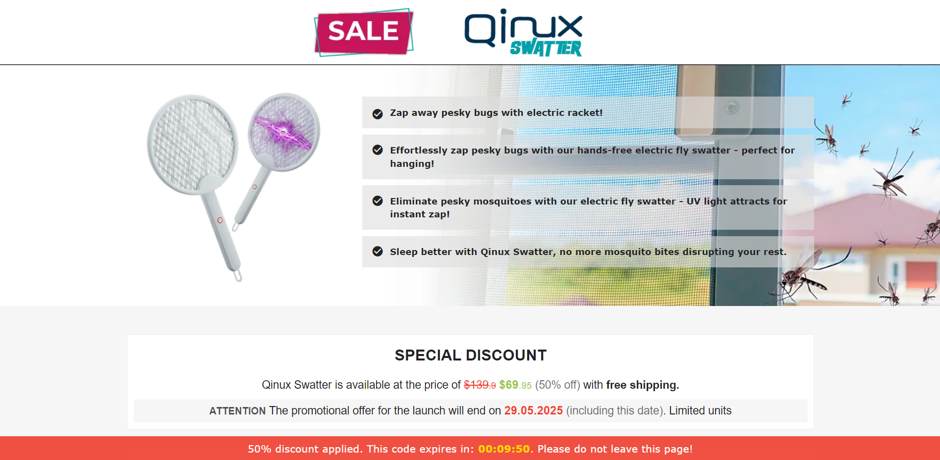 | Offer Name: | [WEB+MOB] Qinux Swatter – Anti-Mosquitoes Hanging Racket /International (112 GEOs) CPS *FB/TT/Google/Taboola Pixel* [Approval Required] |
