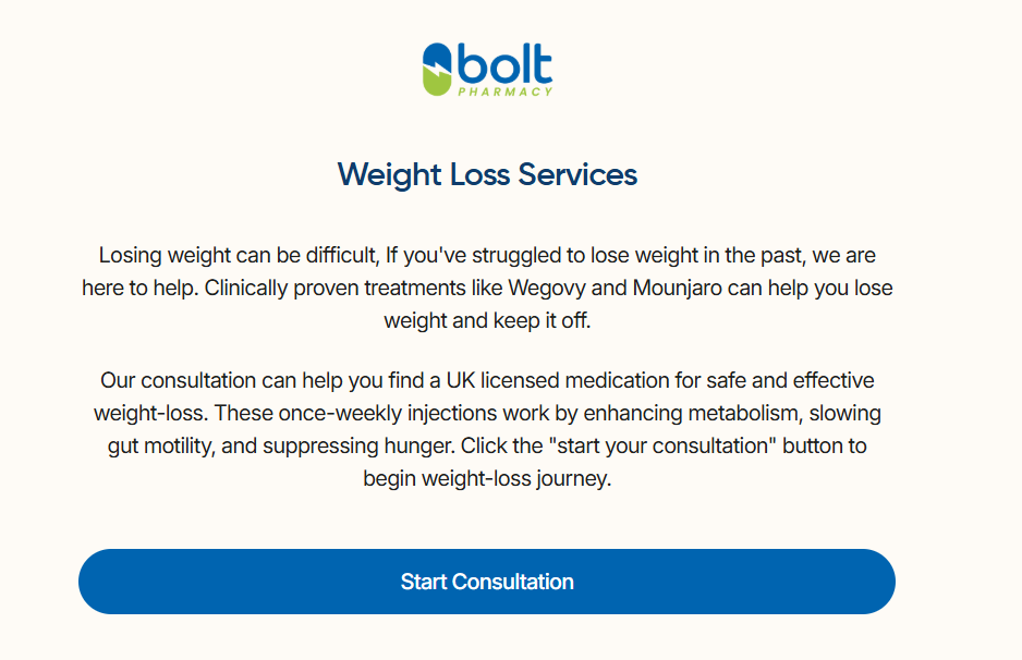 | Offer Name: | [WEB+MOB] Bolt Pharmacy - GLP-1 Medication CTC £95.23 /UK CPS |